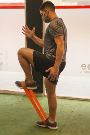 Starting Position: Stand next to a sturdy surface with one hand lightly resting for support.