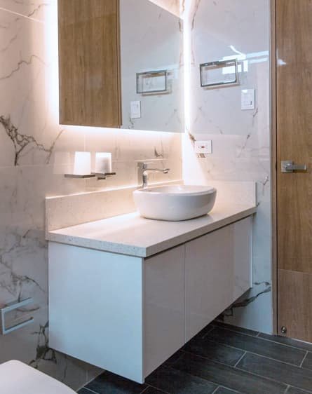 Pro Tip: Install under-vanity lighting to add a soft glow and elevate the vanity’s modern edge.