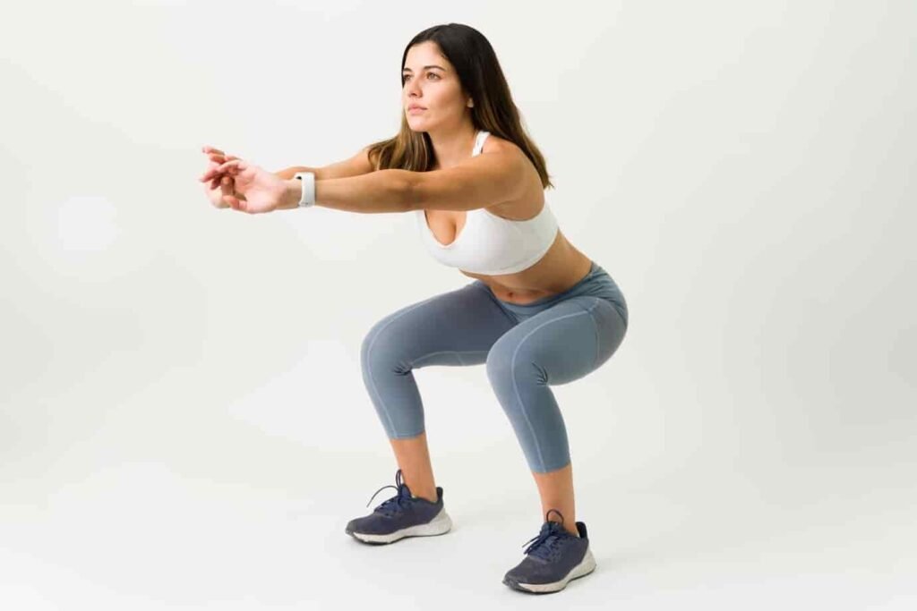 Movement: Slowly bend your hips and knees, lowering your body as if sitting into a chair. Let your arms swing forward for balance. Keep your back straight and return to the starting position. Perform 8-12 repetitions.